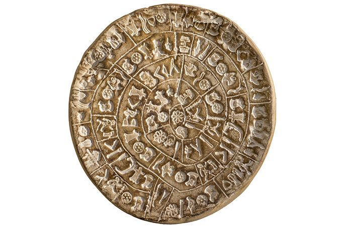 The Phaistos disk was made of fired clay and engraved with 242 symbols in a spiral formation on both sides. It also remains undeciphered.
