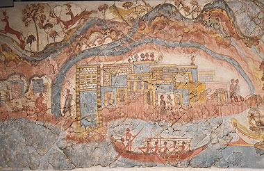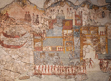 A potential apiary (a place where bees are kept) is depicted in the structure painted on the south wall of the Miniature Frieze from the West House at Akrotiri, Thera. Covering the slope of a hill, it comprises dual vertical blue bands on its western edge as well as four horizontal blue bands, five rows of black triangles with circular openings at their base alternating with the aforementioned bands. In addition to an apiary, this has been deemed a shipshed, storage area, and more.